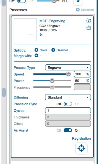 After that I hit print and went to the laser cutter. I set the jog and adjusted the focus. After that I opened the Air Assist and started the ventilation system. Then I started the job.