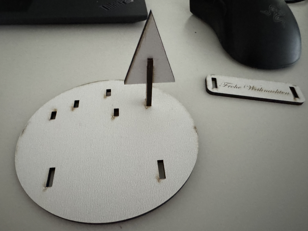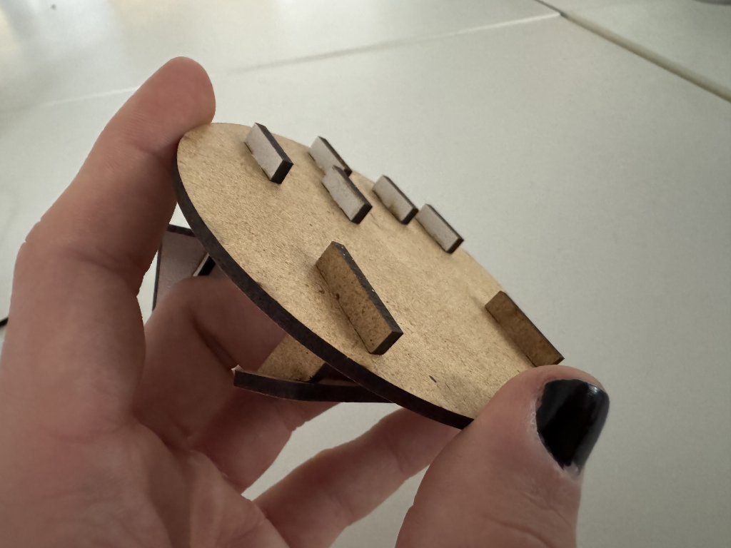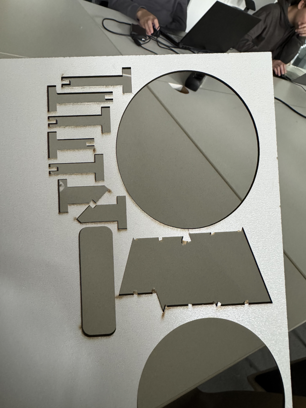 Here you can see some of the resulting pieces from the cut. I then tried to assemble the pieces and found out that the kerf for the base plate was to much and the pieces didn’t fit. So I recut the baseplate.