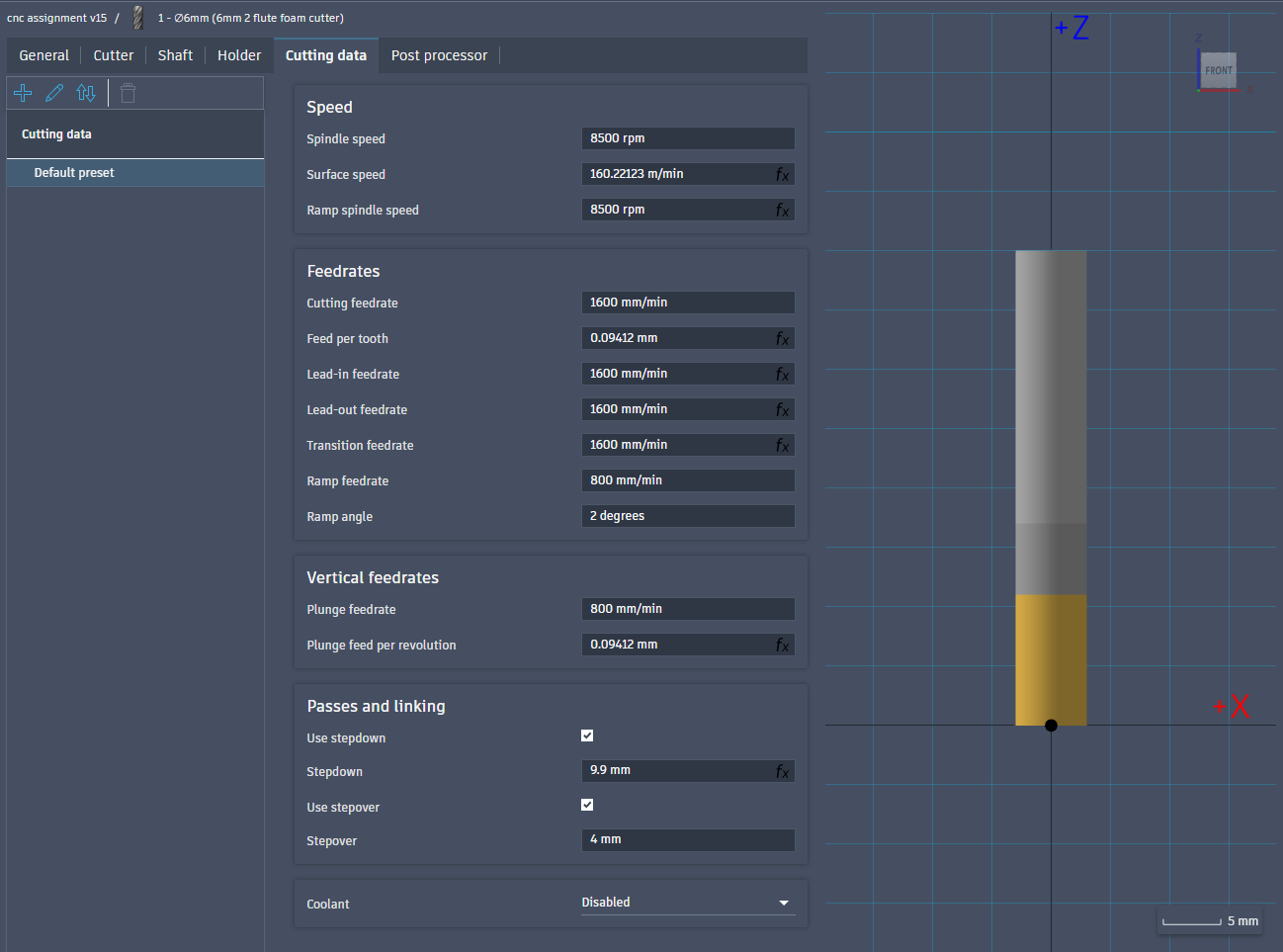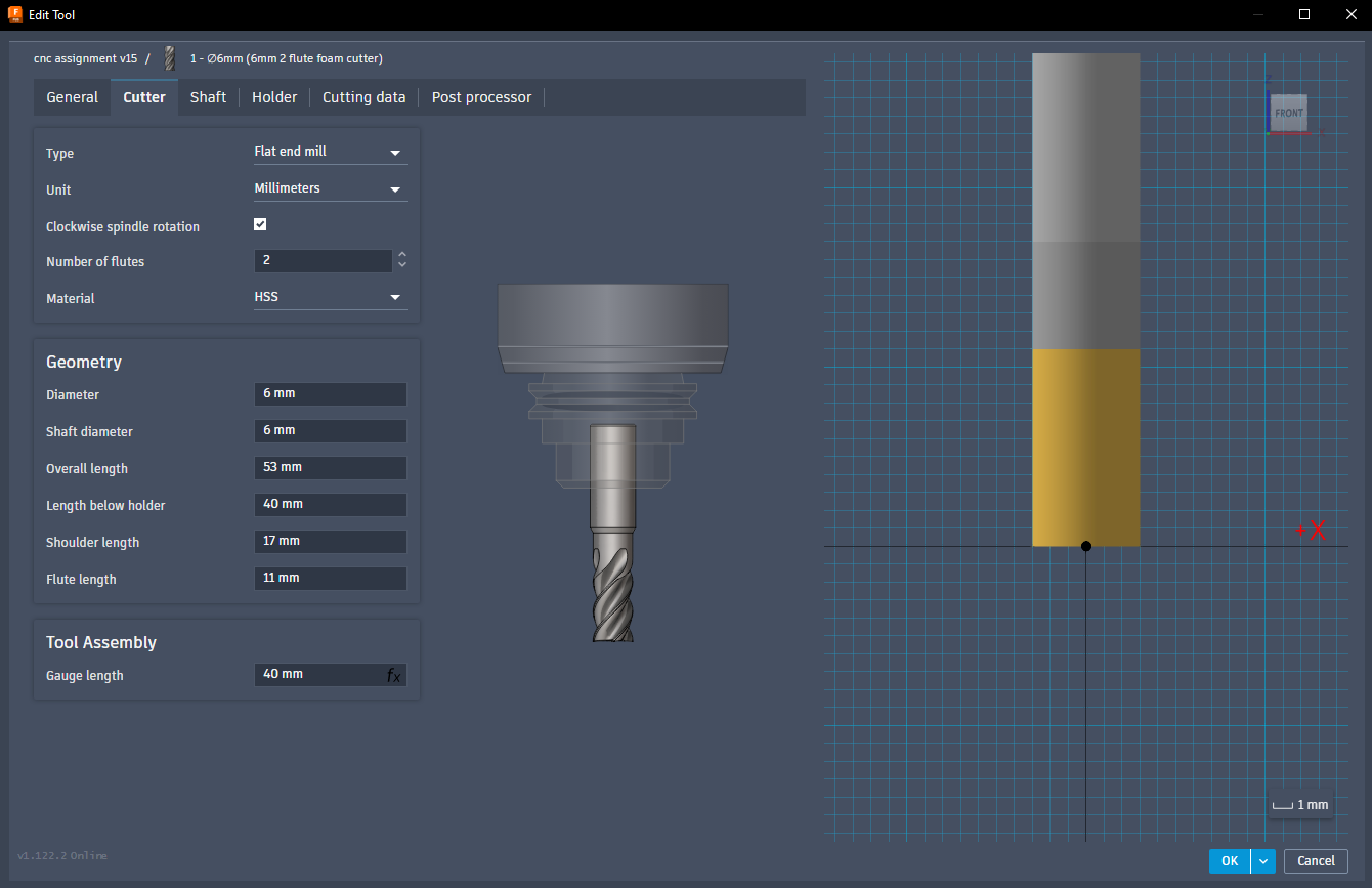 Then I had to create the two tools to use in the cutting of the piece. First I created the flat end tool, configuring it according to the actual drill bit in the lab. The cutting speed, spindle speed and stepover could be set relatively high, since I am machining my piece in foam.