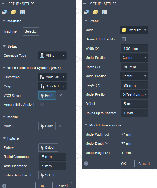 I then switch to the manufacturing mode in Fusion and created a manufacturing setup. There i specified the stock size and set the origin point for the milling operation.